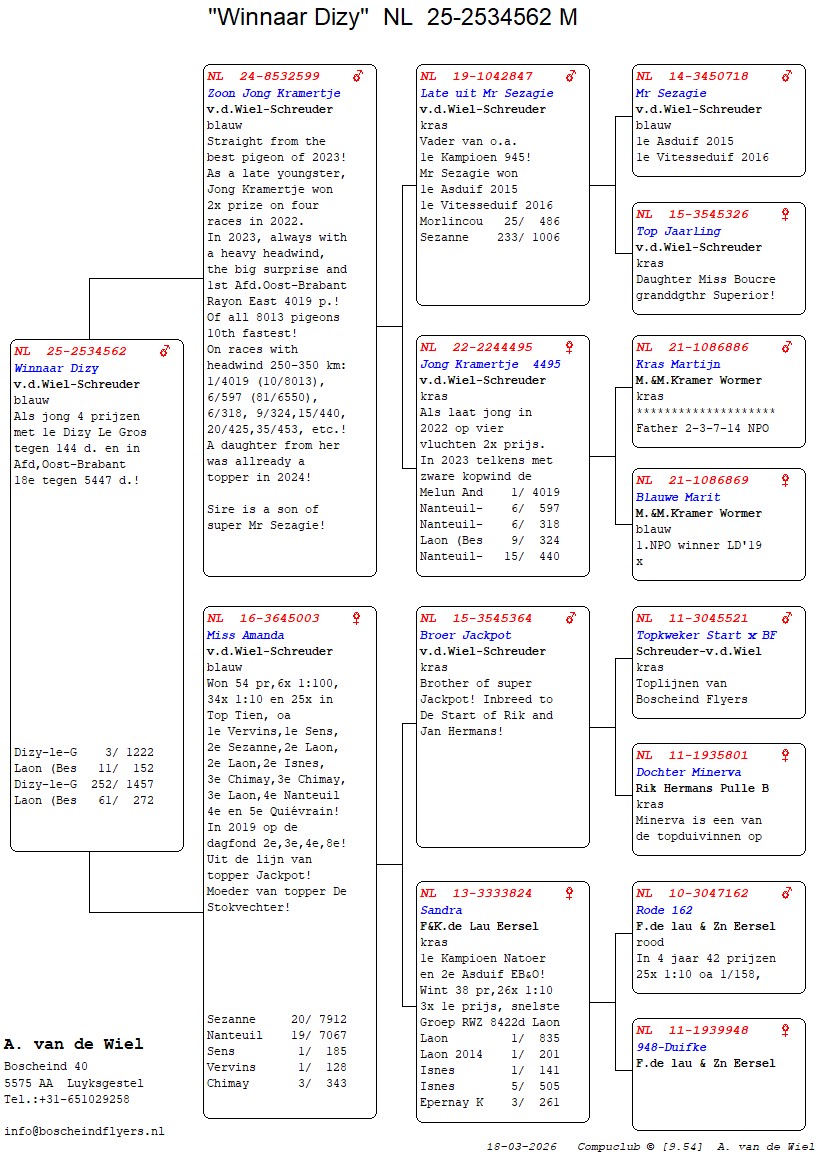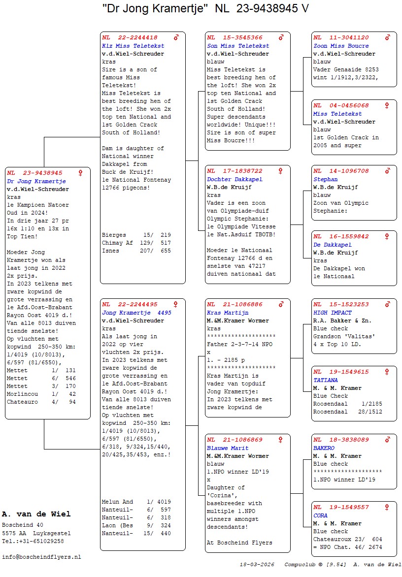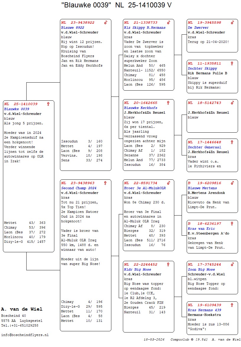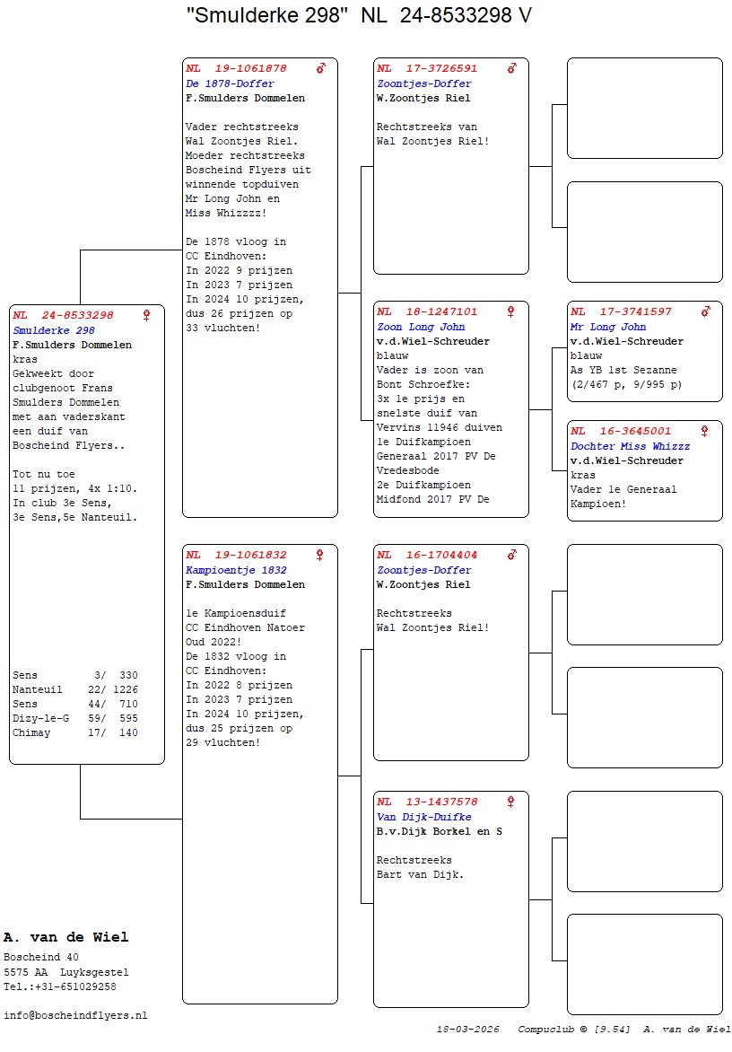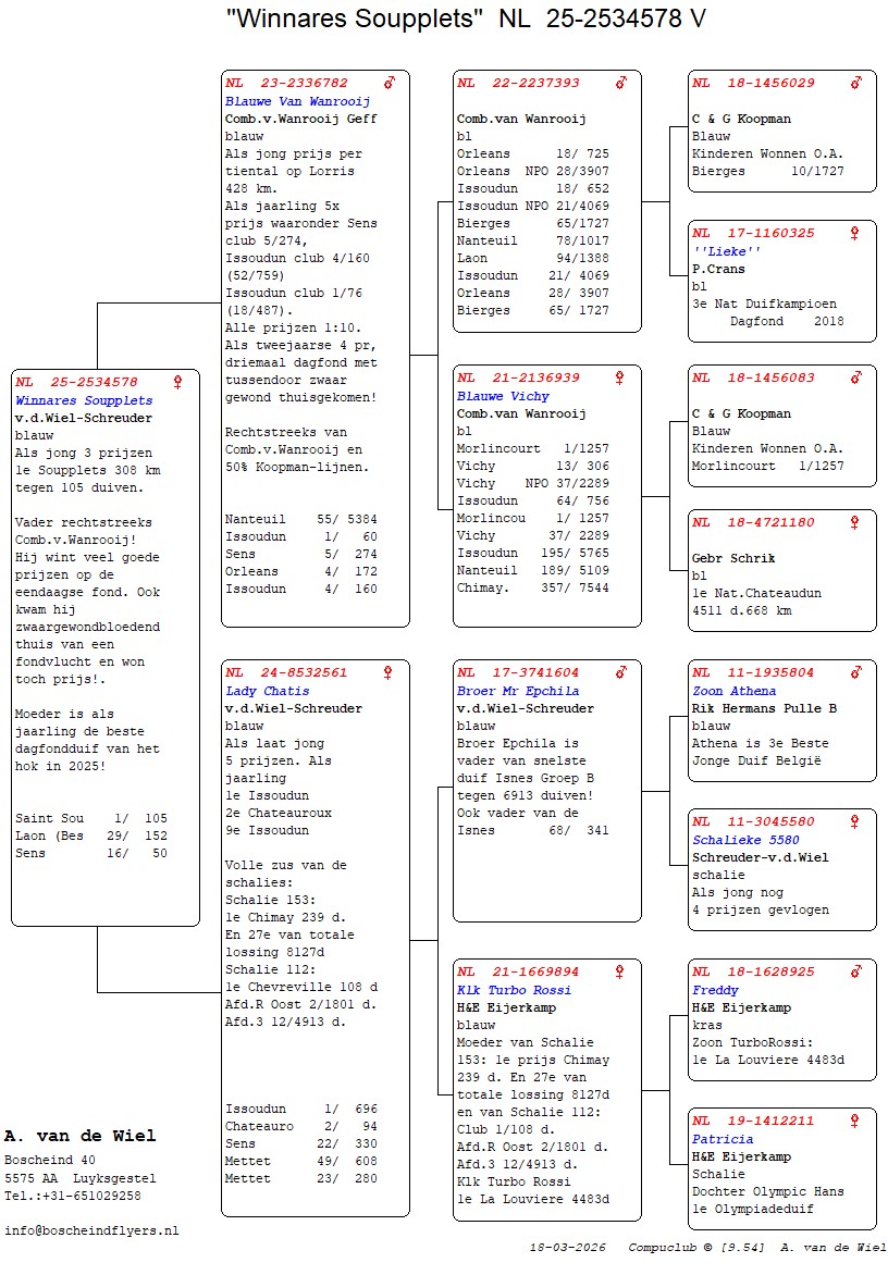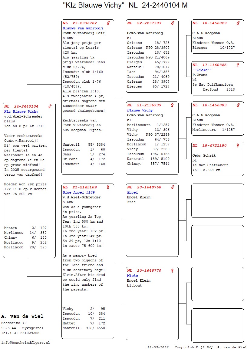 | Plc | Ringnummer | Aankomsttijd | Geslacht | Snelheid M/Min | Stamkaart | | 1 | 3/9438945 | 09:23:36 | V | 1405.502 |  | |