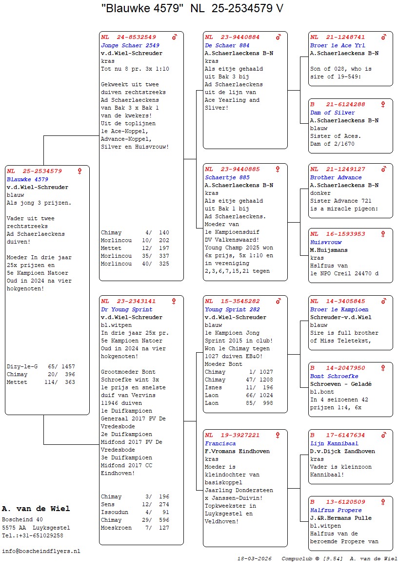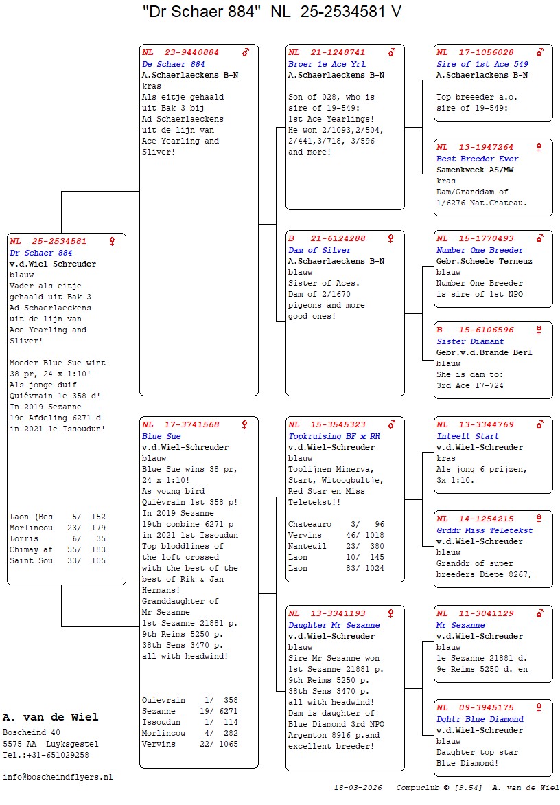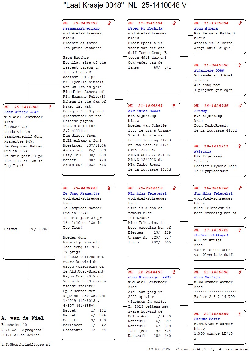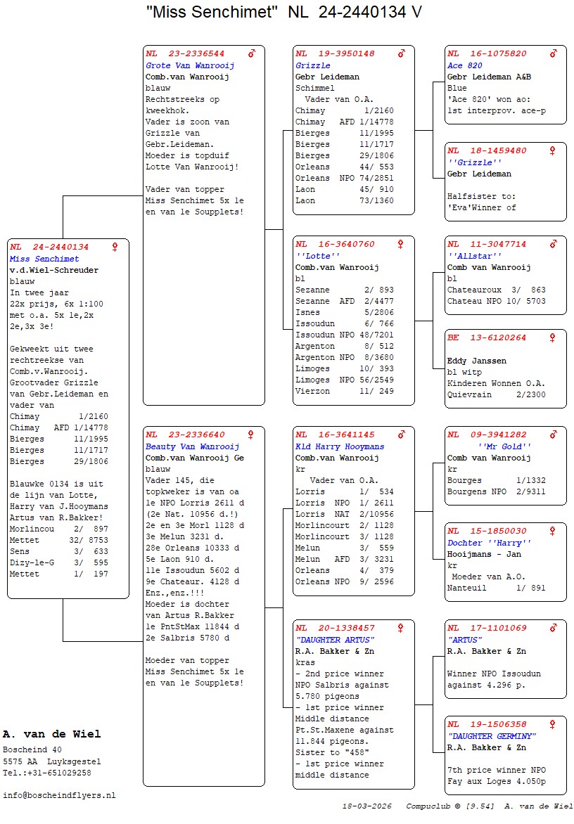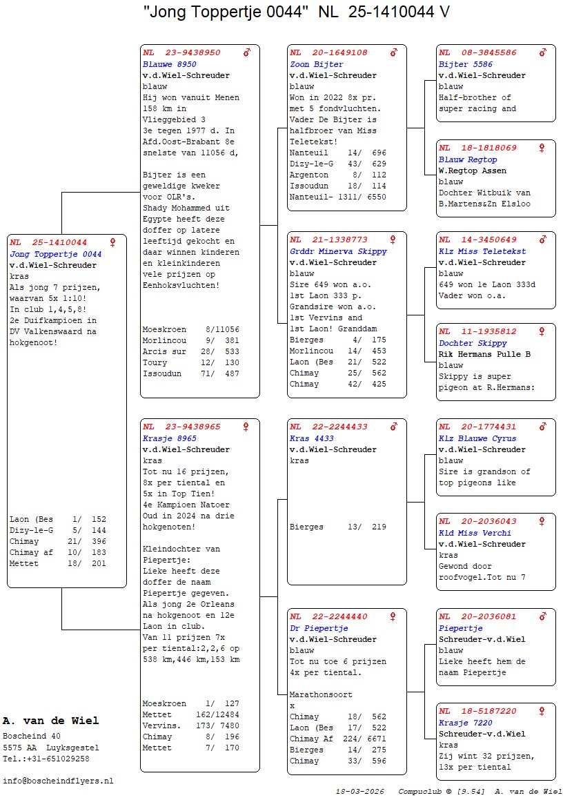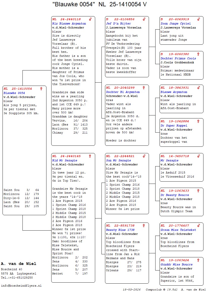 | Plc | Ringnummer | Aankomsttijd | Geslacht | Snelheid M/Min | Stamkaart | | 1 | 3/9438945 | 09:23:36 | V | 1405.502 |  | |