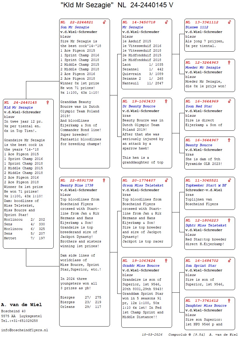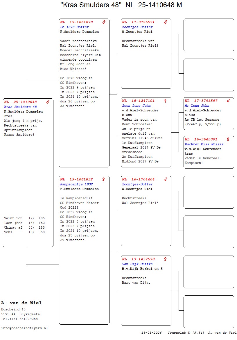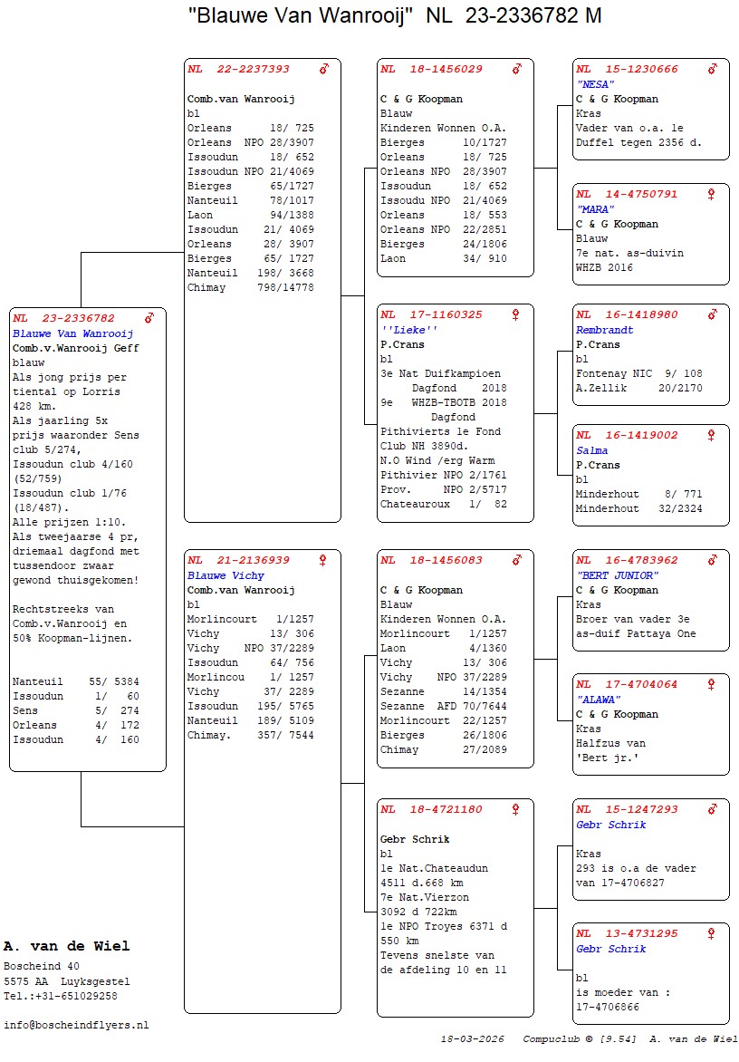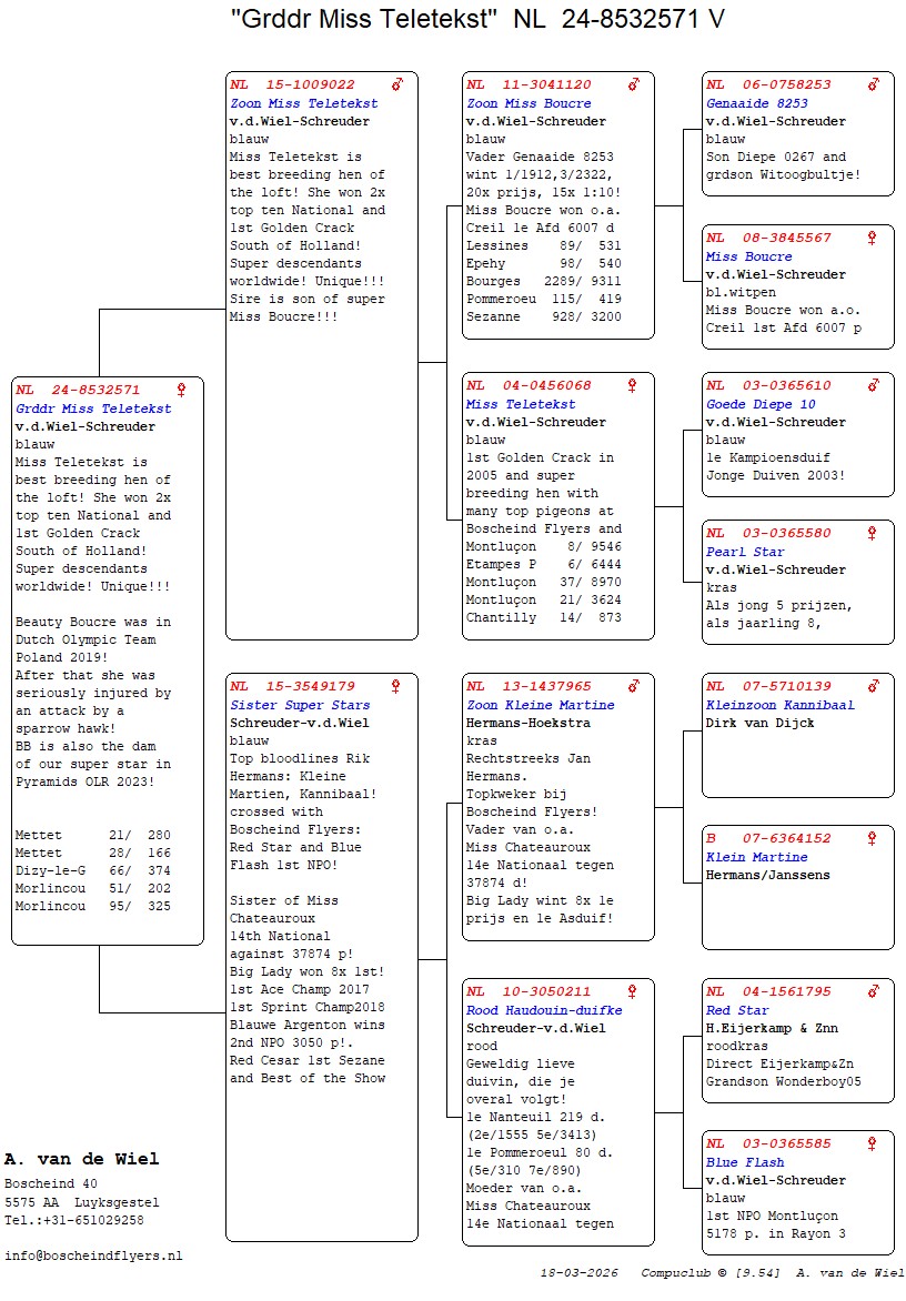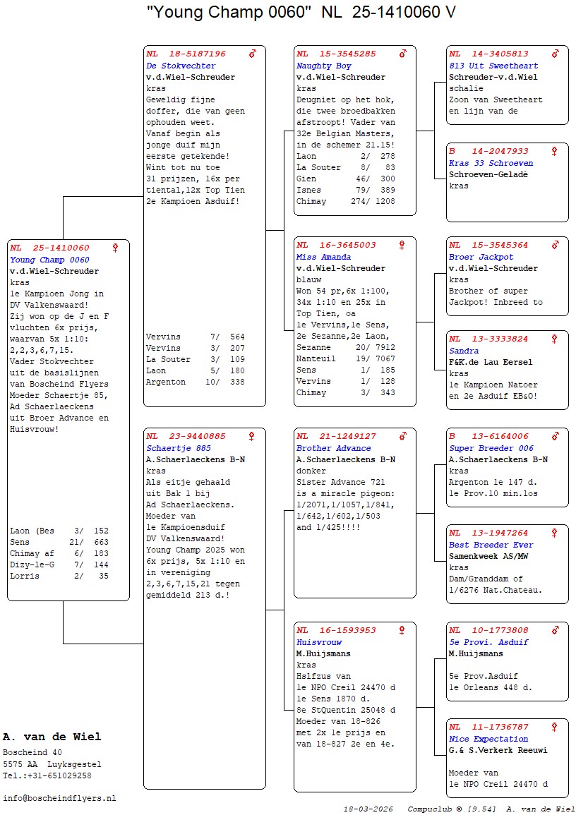 | Plc | Ringnummer | Aankomsttijd | Geslacht | Snelheid M/Min | Stamkaart | | 1 | 3/9438945 | 09:23:36 | V | 1405.502 |  | |